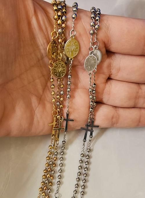 Pulsera en forma de rosario, dorada, tres colores, plata.
